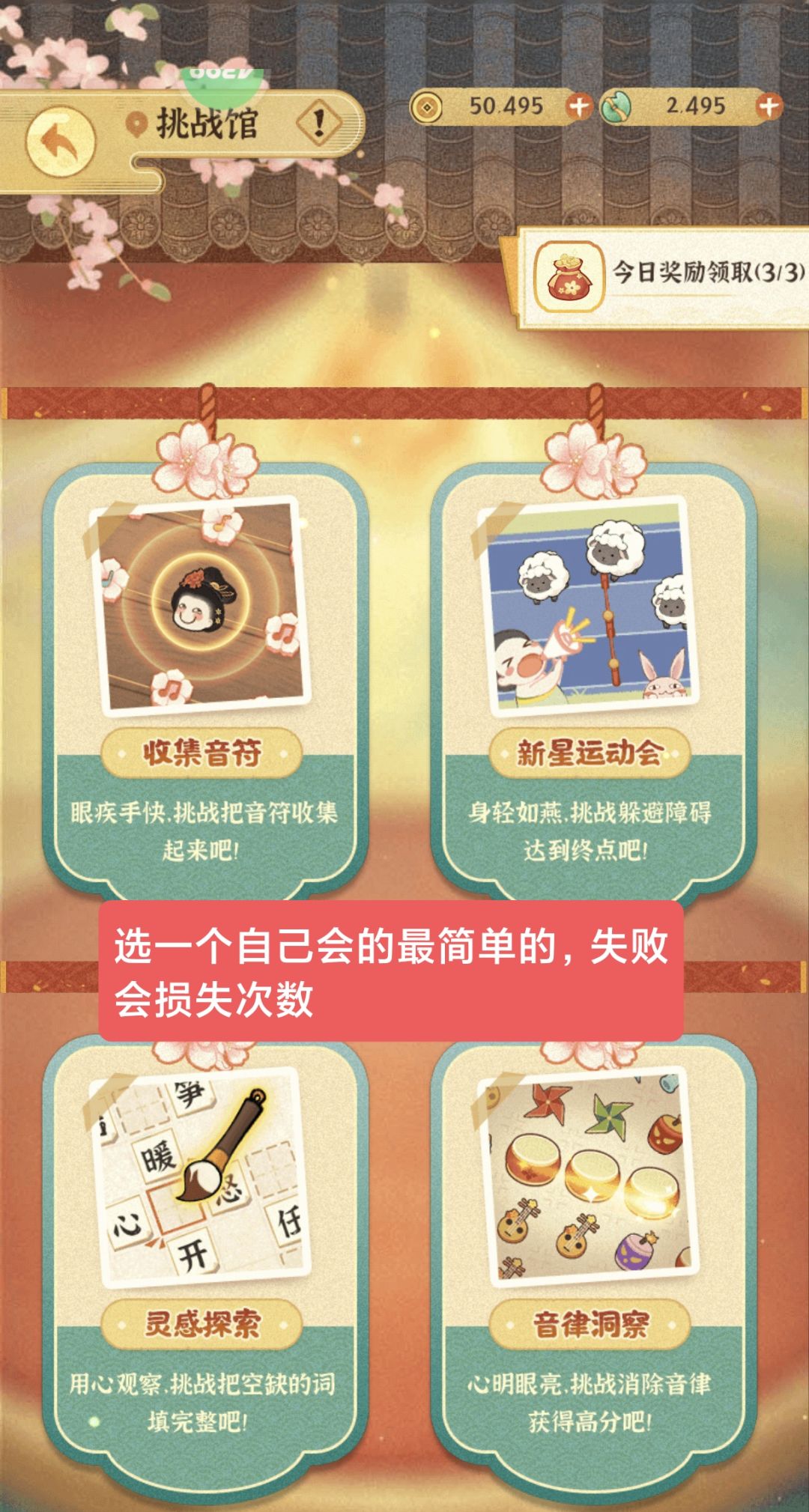 挑战馆选择自己熟悉上手的,失败会扣除奖励次数!