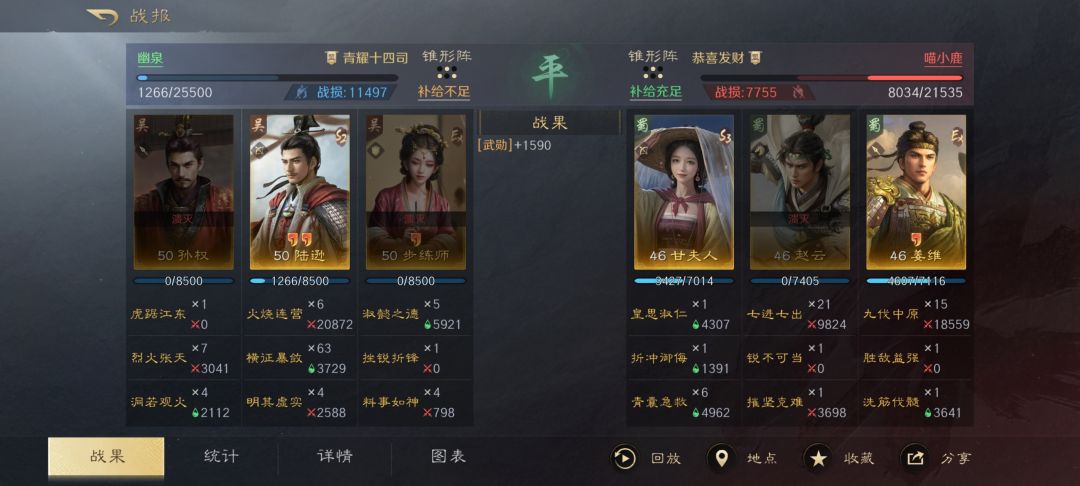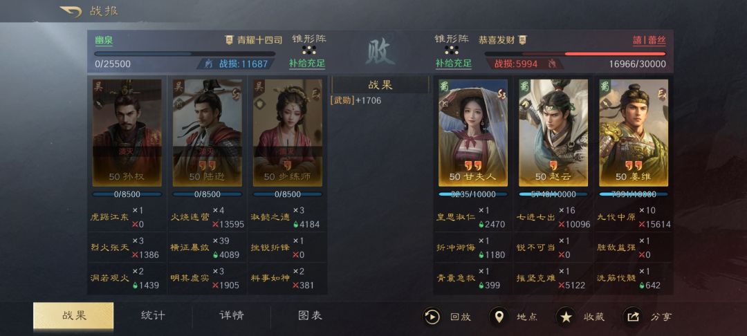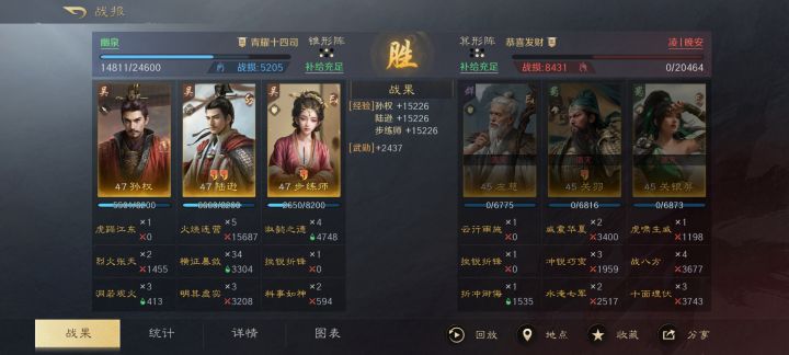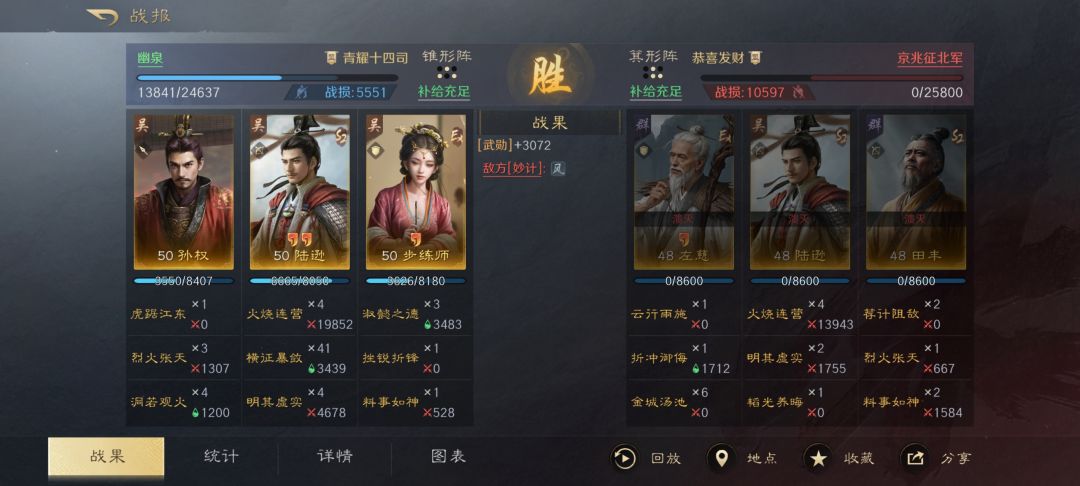 战报分享一下,应该说是变种肉陆逊,洞若保证好陆逊清醒,步皇后奶量足够,挫锐防止暴毙,对付大部分懒得调属性的人都有奇效,不用折冲,折冲可以给三仙或者姜维队。