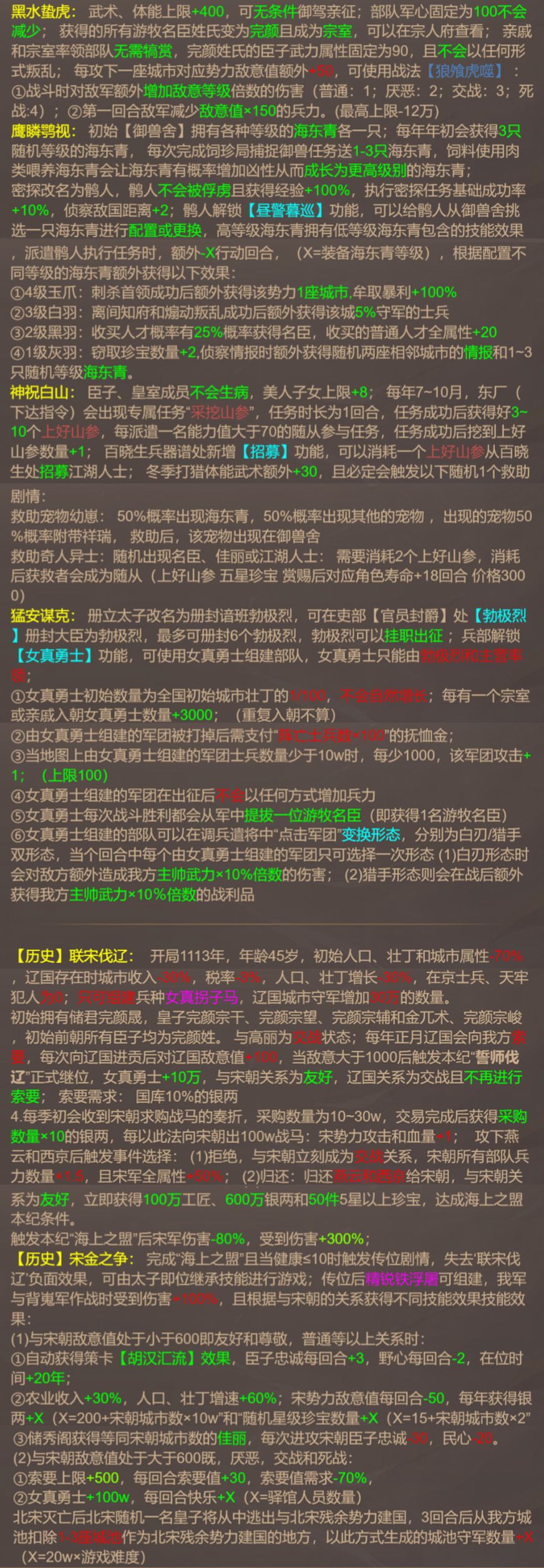 “女真不满万,满万不可敌”。在历史上,女真勇士常常以少胜多,创造了许多辉煌的战绩。如护步达冈之战金太祖亲率两万骑兵大破辽军十万。而在游戏中,女真勇士骁勇善战、善于以少胜多的特点也有很好的体现。在游戏中可以册封大臣为勃极烈,而且勃极烈可使用女真勇士组建部队。这不仅贴合历史,而且也体现了对【女真勇士】和【勃极烈制】技能的继承和发展。而通过尽量少的女真勇士军团士兵来换取巨额收益,不仅体现了本卡的特色玩法,而且也考验了大家权衡利弊的能力。无条件御驾亲征,御驾亲征时可以自由上朝和部队军心不会减少等增益效果将助力享受亲自攻城略地的成就感,新战法【狼飧虎噬】也将丰富战法池。