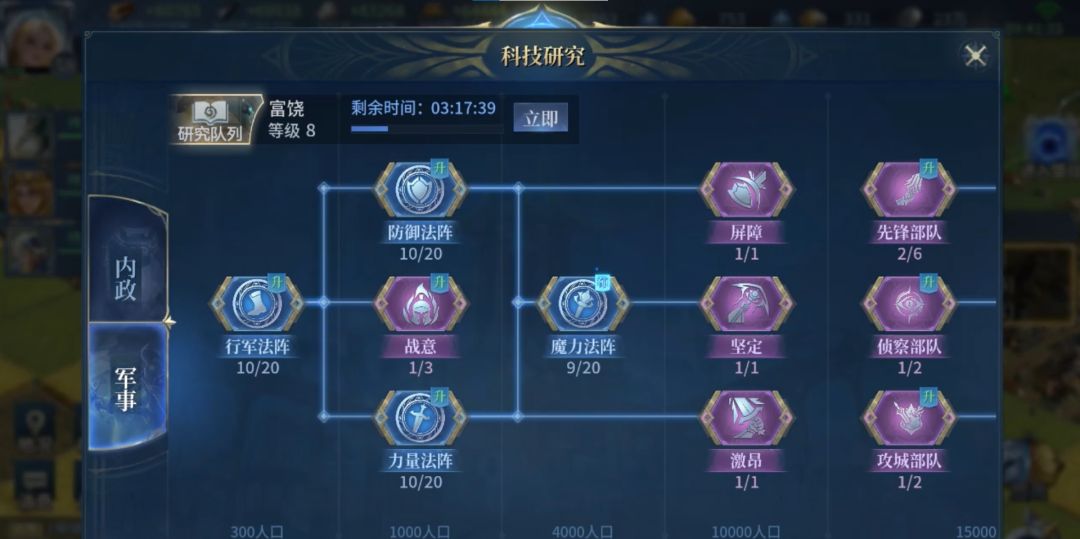 其次是科技,点击学院——军事即可查看,除提升各种属性外,还能强化双站位能力、拓展部队功能,例如:先锋、攻城、侦察队等。还有解锁战意,消耗额外体力能临时大幅提升部队战力。如果想要学习更多的风格技能也需要升级科技。