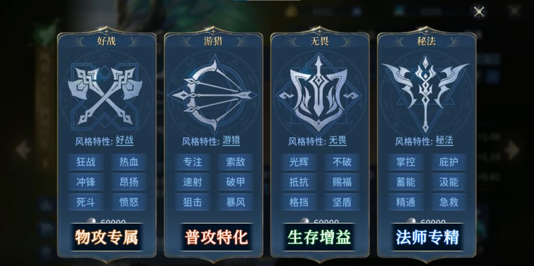 最后则是风格技能,开启战斗风格后,花费9万银币即可习得风格技能,6万转职、3万解锁技能。目前战斗风格共有四大职业,普攻特化——游猎;法师专精——秘法;物攻专属——好战和生存增益——无畏。具体职业和技能就要根据英雄和阵容本身来选择。