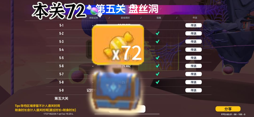 第五关共有6个宝箱,6个宝箱集齐可得72颗糖果