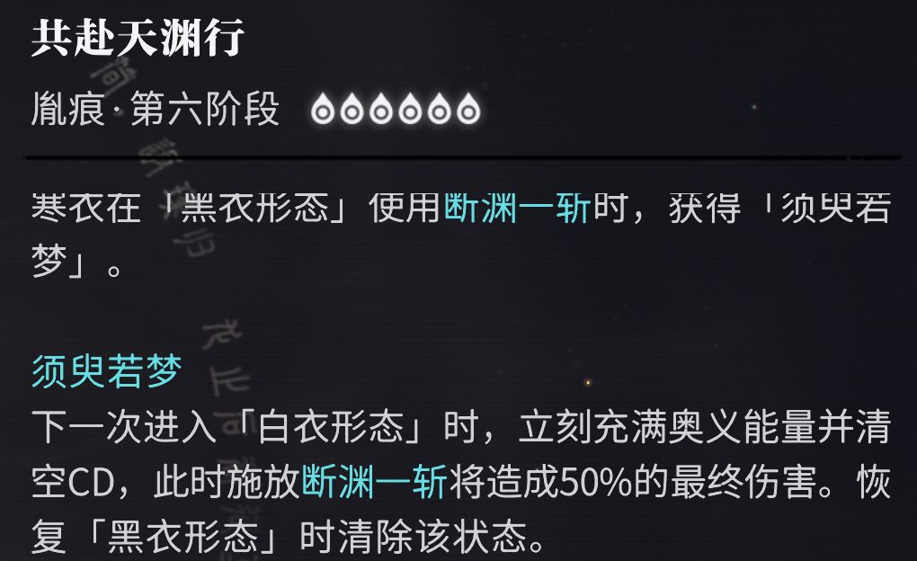 6命开完黑衣大,进入白衣形态时能直接释放白衣大招,但是此时大招伤害减半。