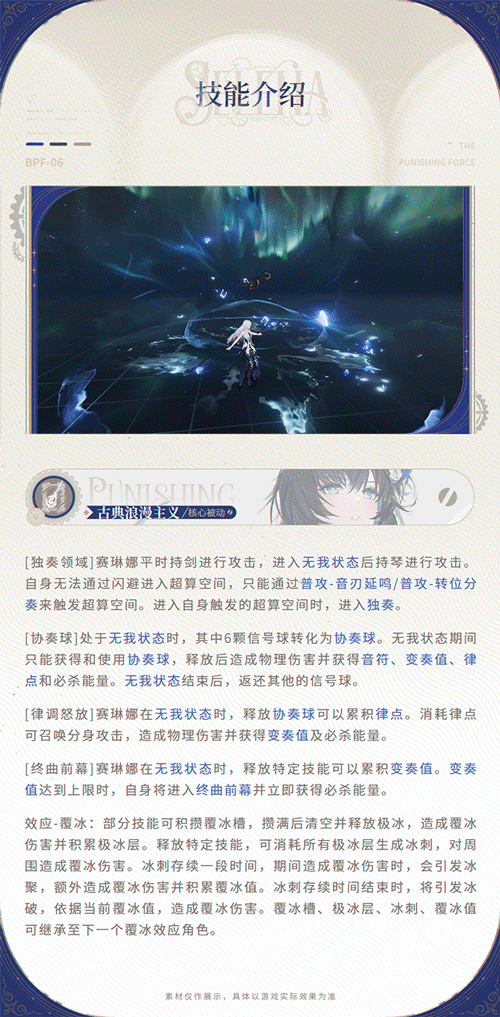 [效应:覆冰]部分技能可积攒覆冰槽,攒满后清空并释放极冰,造成覆冰伤害并积累极冰层。释放特定技能,可消耗所有极冰层生成冰刺,对周围造成覆冰伤害。冰刺存续一段时间,期间造成覆冰伤害时,会引发冰聚,额外造成覆冰伤害并积累冰结值。冰刺存续时间结束时,将引发冰破,依据当前冰结值,造成覆冰伤害。覆冰槽、极冰层、冰刺、冰结值可继承至下一个覆冰效应角色。