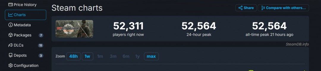《真三国无双:起源》在昨天正式解锁发售,Steam国区售价349元。据SteamDB统计,该作首发Steam同时在线峰值为52564人,当前在线玩家52311人,尚有一定的增长空间,但不大。