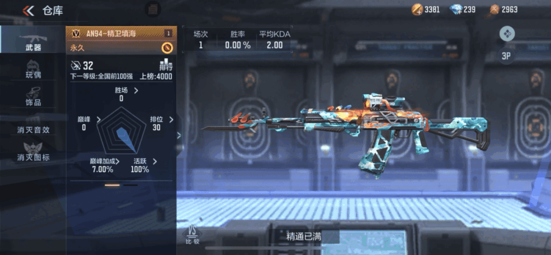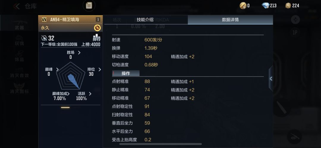 该武器对受击稳定性也做了提升,拥有0.2的受击上扬。实战体验中感受很明显,尤其在和敌人对枪时,准心更加稳定。武器的精准度相对于其他英雄级AN94系列也有所提升,实战中更容易上手,尤其在点射和小连发上更加精准,很适合喜欢M4速点的小伙伴使用。除此之外,AN94-精卫填海这把武器在便携和穿透方面也做了略微提升,在实战中移速更快,穿透伤害也更高。美中不足的是该武器的伤害距离衰减没有优化,这也意味着远距离对枪时伤害没有其他英雄级AN94系列高,个人推荐选择近距离或者中距离使用此把武器。