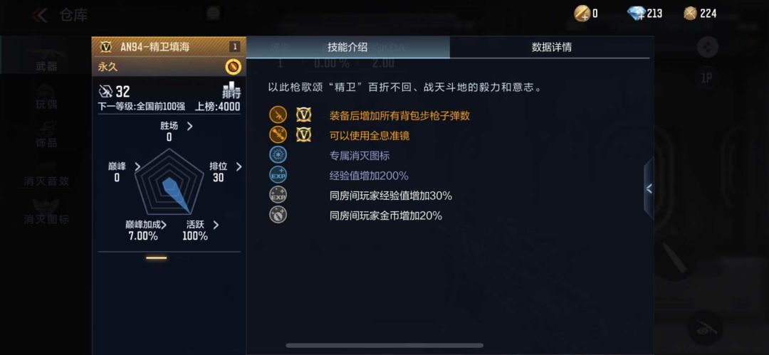 背包内装备AN94-精卫填海后可获得200%经验加成,并且背包内所有步枪可额外获得2发主弹匣子弹数。该武器还可以使用全息准镜,可在对局内自由切换,除此之外,还有专属击杀图标以及为同房间内玩家提供30%经验加成和20%金币加成。