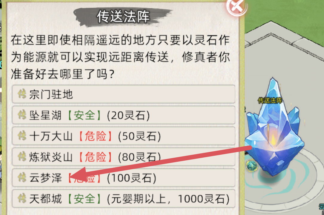 我们这里花100传云梦泽,左转进传送阵到炎山