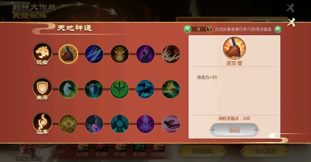 另外,仙术师可以在进入地图前在“天地神通”中进行领悟,消耗一定数量的灵蕴值便可以点亮一个天地神通,其增益效果将会在仙术师挑战任意难度的夷陵秘阵·封神大作战时都会自动代入。