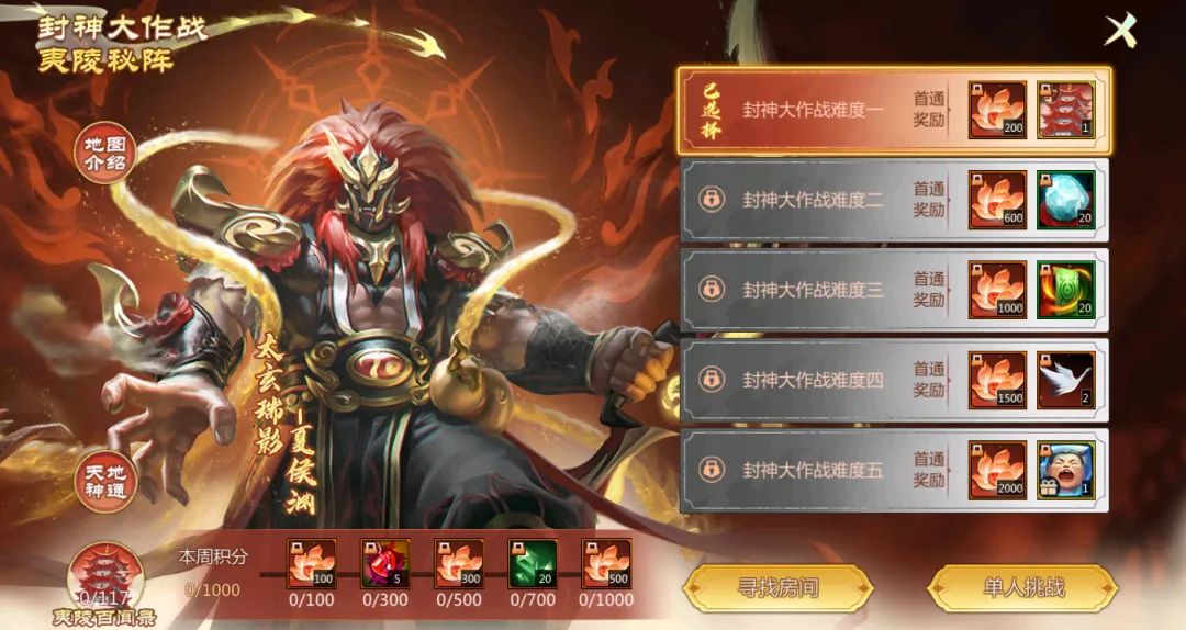 【夷陵秘阵·封神大作战】是一个肉鸽类地图关卡玩法(不带入外部神兵值),玩法最多支持3人参与,也可选择单人挑战。