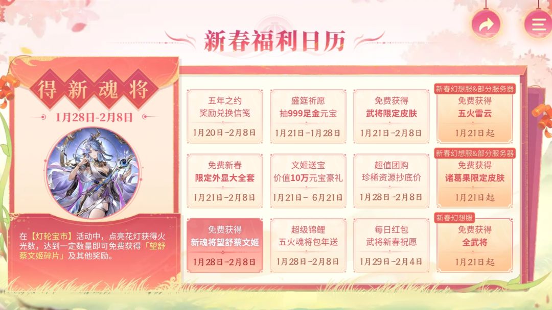 这次三幻的新春福利非常非常多!非常推荐新玩家入坑和老登回归!新武将【望舒蔡文姬】更是颜值强度都在线