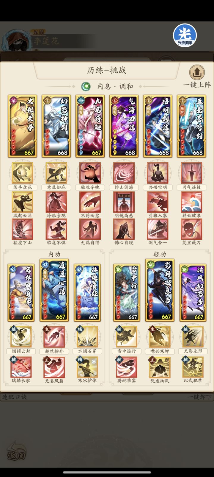 1.凑齐了刀,剑,拳,奇四种武学,基础搭配依然是调和剑根基(悟明+五岳,调和剑雷打不动的组合)。