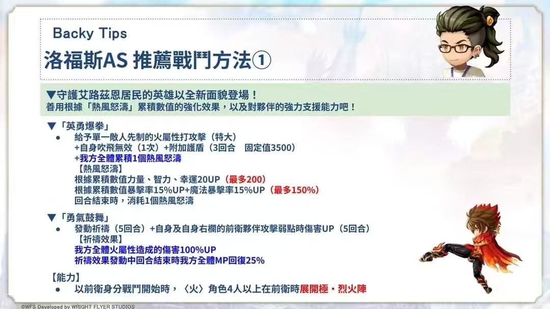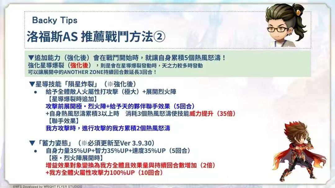 全队辅助能力:开局4【火】展火az,力智幸200点up+物魔暴击率150%up(需叠10珠,五星技能每次使用叠1珠,回合末耗1珠),祈祷(效果:火伤100%up+回合末回复25%mp),力智速70%up+火属伤100%up(需火az);【觉醒】后:展火,【星爆】时:展火az+【天】联手(攻击时累积2珠);【天】星爆时:az延时3回合。