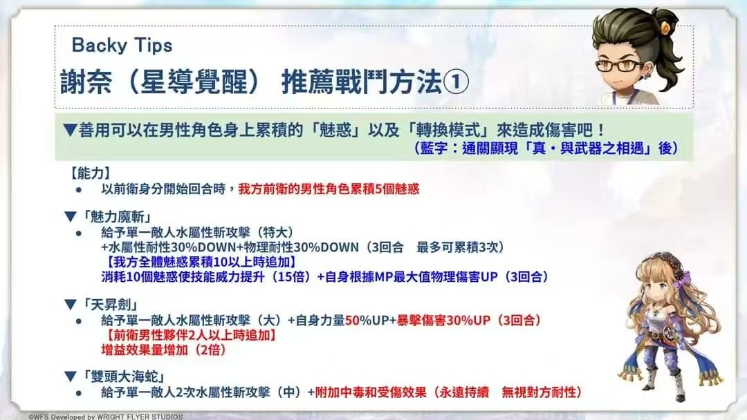 自理:心技(需2男),力量100%up+爆伤60%up(需2男);【觉醒】后:最大mp30%up,根据自身魔法攻击力50%增加力量(最大250)。