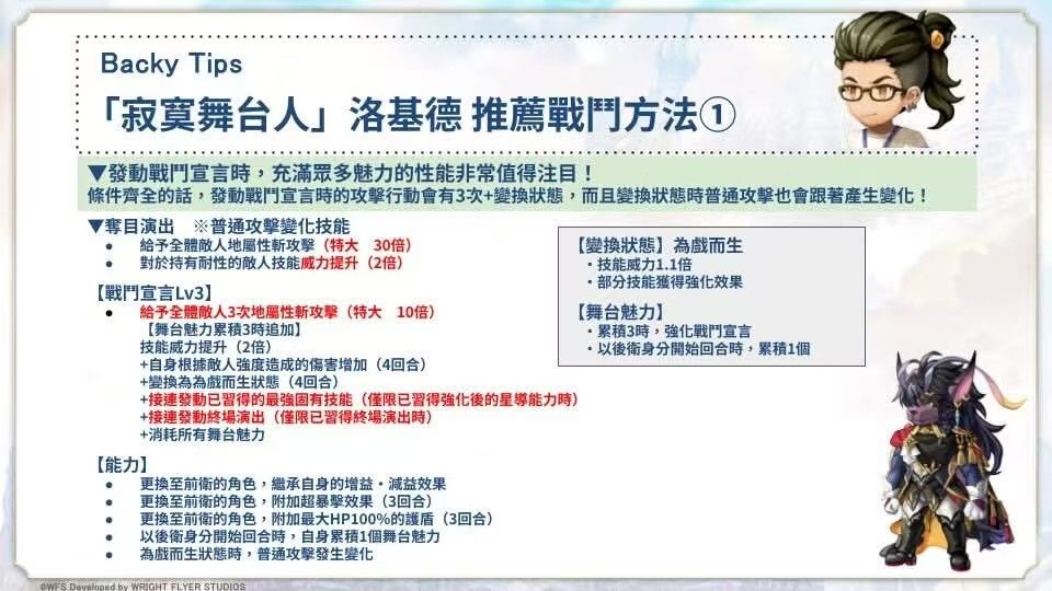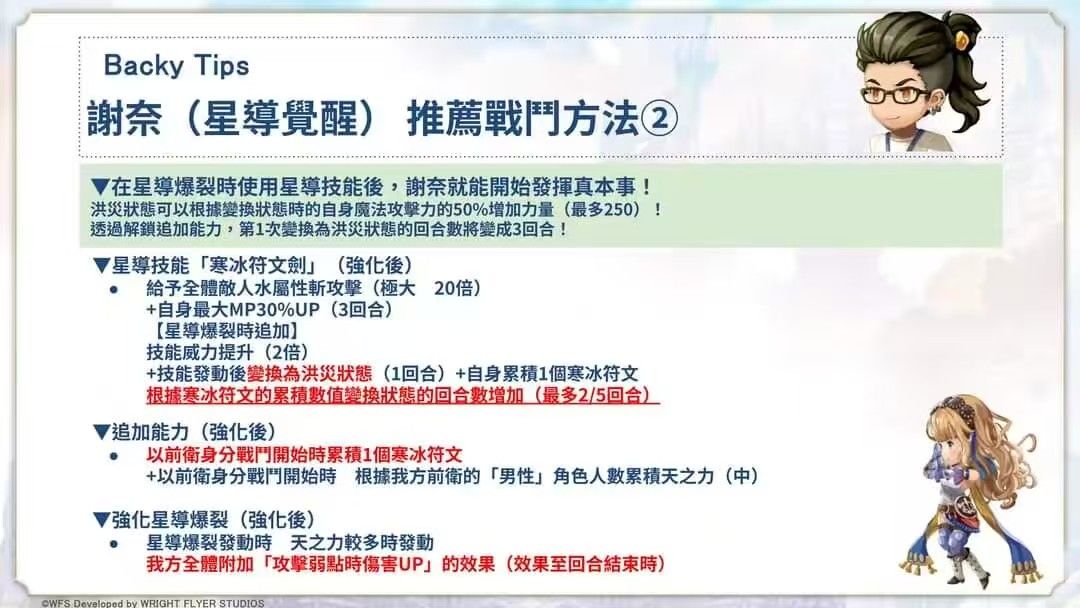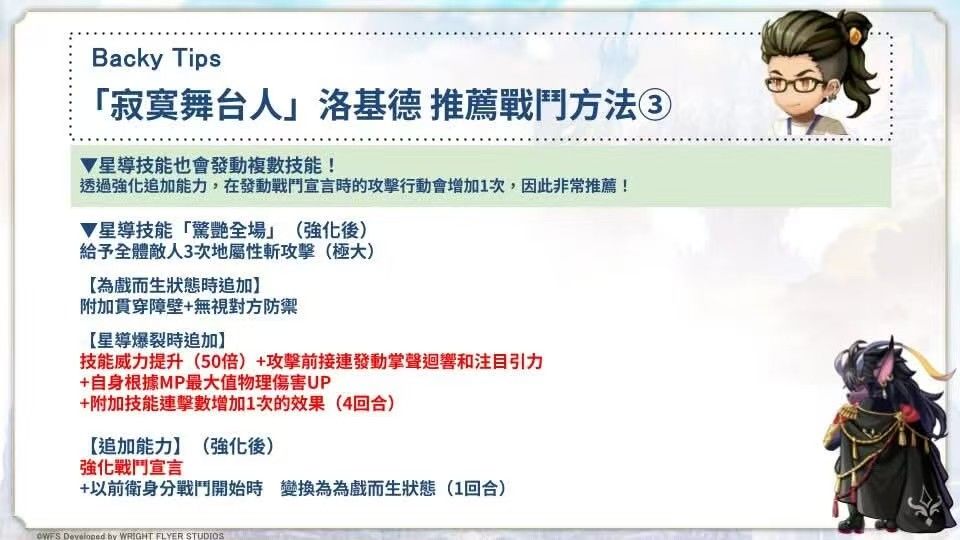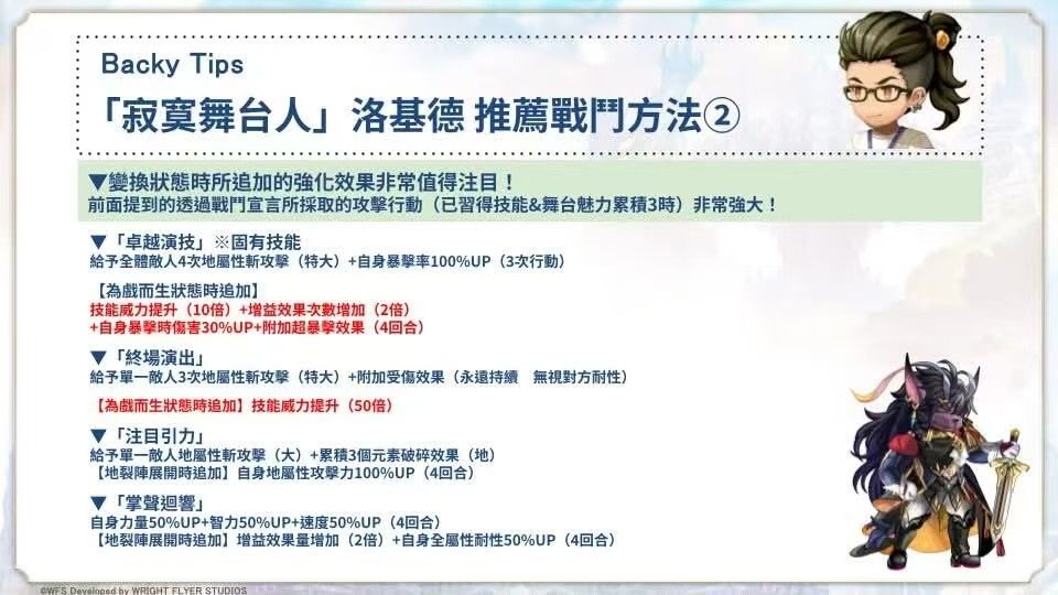 ②星导技能星爆:(按释放顺序)(地zone中)自身力智速100%up+全属耐50%up;单体大地斩+累计3层元素破碎-地+(地zone中)自身地属伤100%up;自身心技一体+连击数+1+3次极大地斩(50倍)(【为戏而生】状态时贯穿+无视防御)。