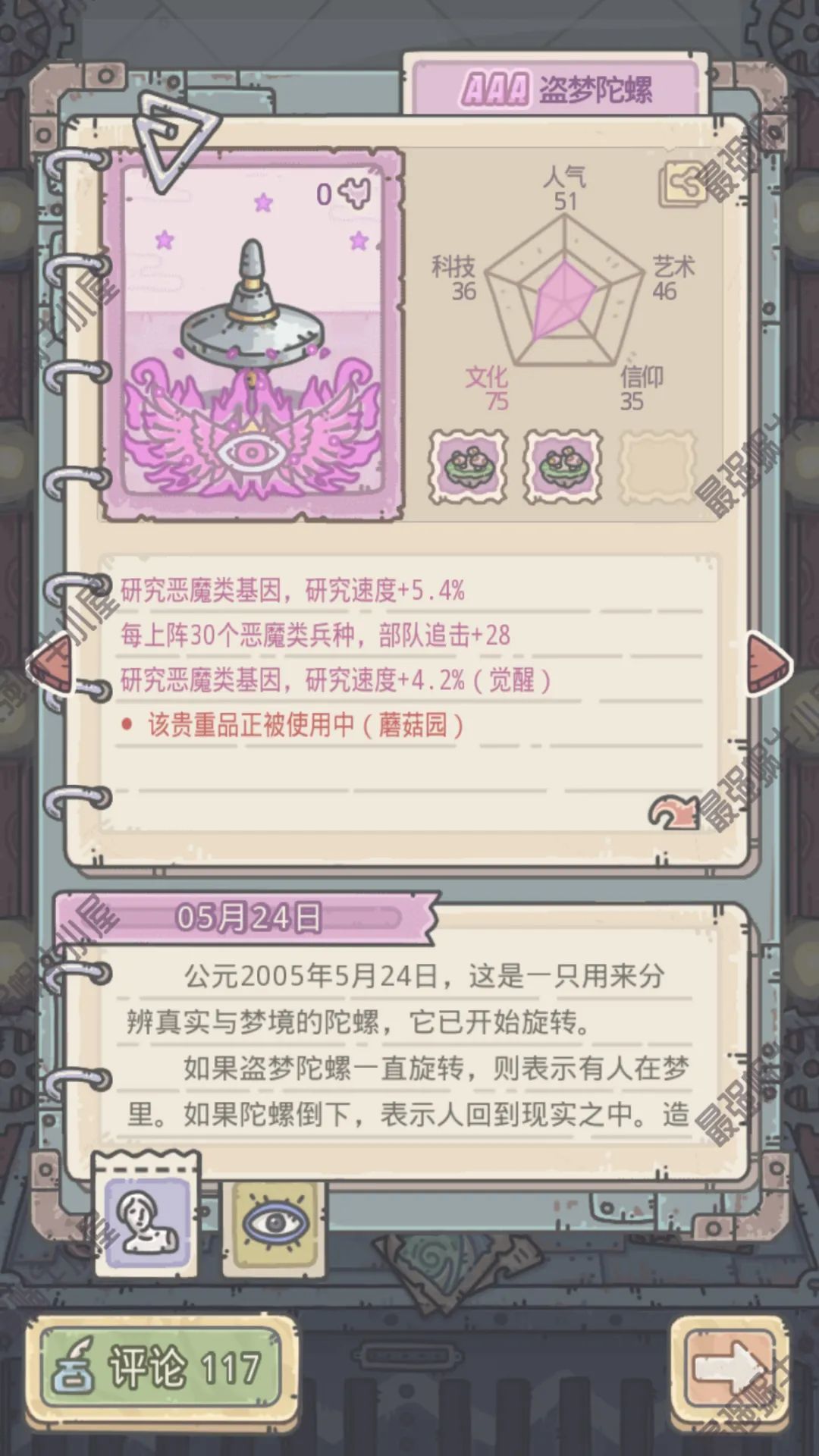 ●增加的攻击力比其他的紫色贵重品多,和文化-盗梦陀螺有一个顺路的小共鸣,推荐。