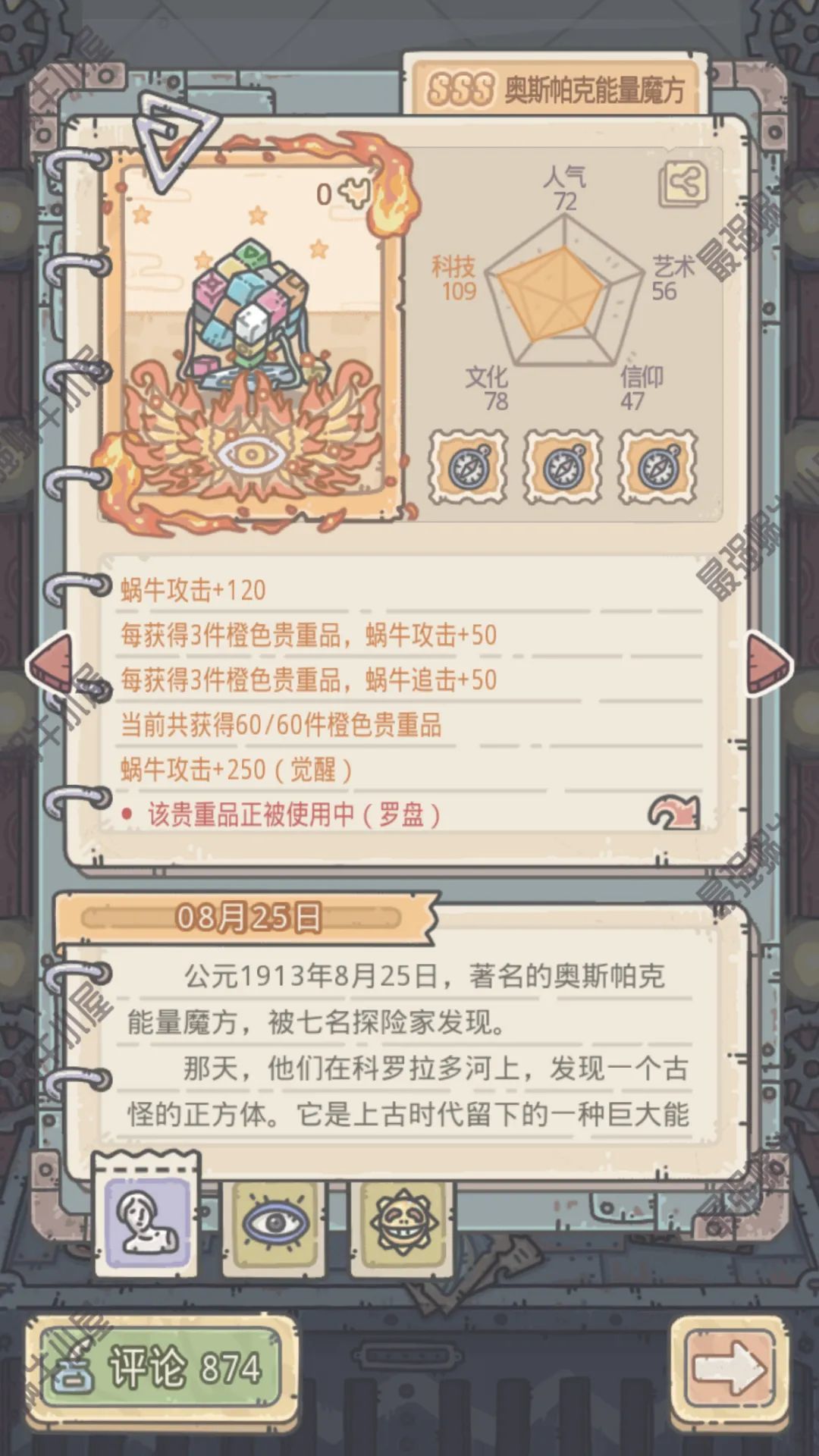 如果是每日6元礼包玩家,那么魔方会很快满星,250的攻击力也比一般的橙色贵重品高,推荐觉醒。
