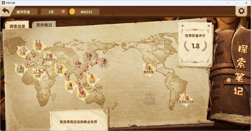 全球调研在游戏中体现为:玩家需要航行到多个不同的城市,询问当地的饮食、了解当地的特产和地理环境特征。