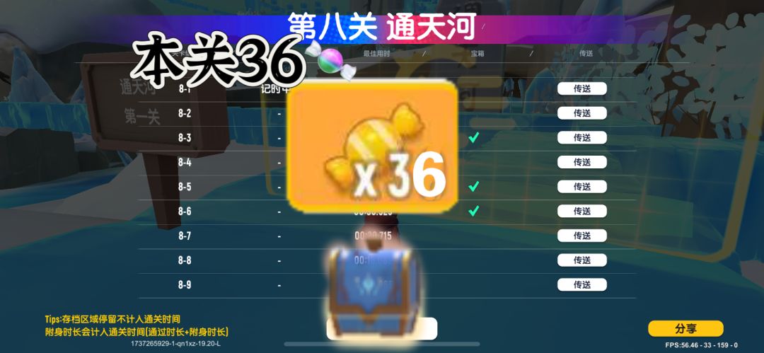 第八关共有3个宝箱,3个宝箱集齐可得36颗糖果