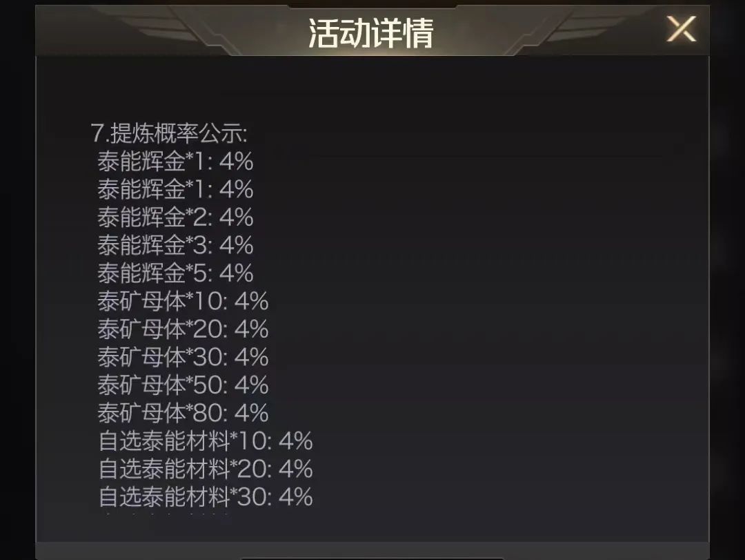 泰矿提炼所活动期间,可消耗提炼装置进行提炼,每次提炼消耗不变,玩家提炼后会随机在提炼矩阵中提炼出一个奖励,包括不同数量的泰能辉金、泰矿母体、自选泰能材料、金币和5分钟通用加速,如公示所示,各种奖励的提炼概率均为4%,小编不再赘述。