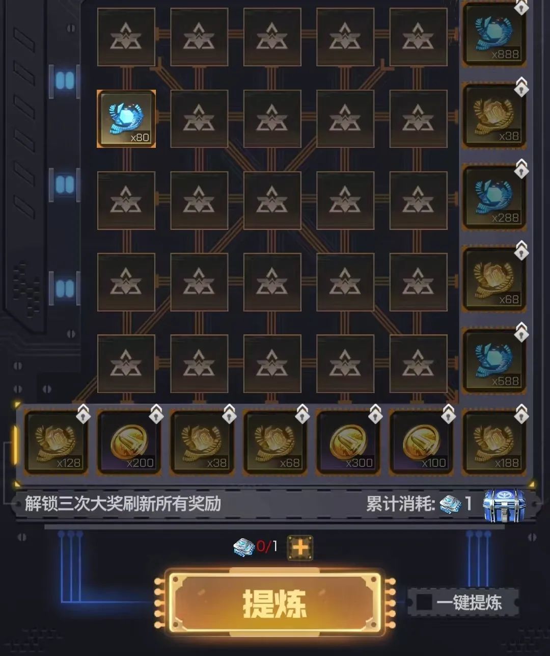 二、连线大奖建议优先选择领取泰能辉金的连线,泰能辉金会是近期游戏内最紧缺的道具了,当提炼矩阵中的大奖可领取次数达到3个及以上时,需刷新提炼矩阵,刷新时没有领取的大奖会自动领取,虽然刷新提炼矩阵后大奖奖励不会发生改变,但出现位置会发生改变哈,提醒大家注意一下。