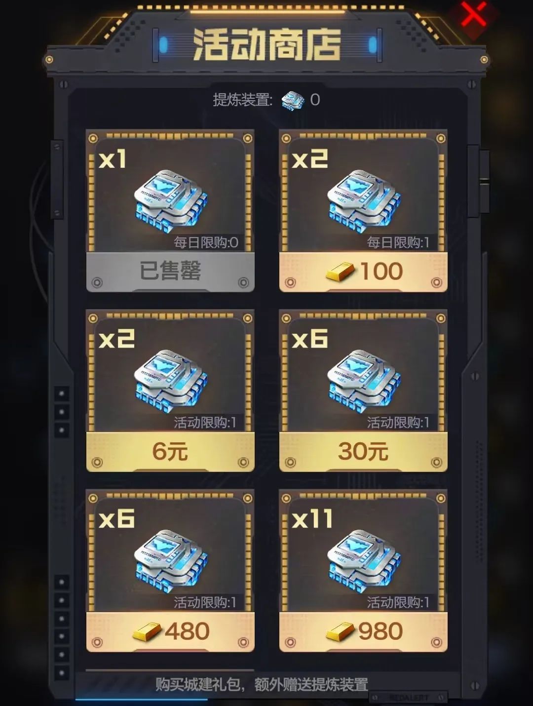 泰矿提炼所活动开启期间会开放专属的活动商店,能够免费或者通过消耗金条、直购等方式获取大量的提炼装置,不同等次的限购次数也不一样,建议金条充足的可以配合联盟总动员活动消耗金条的任务购买,一举两得。