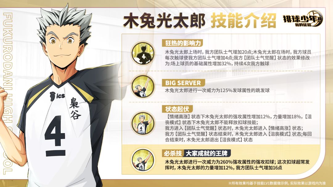【情绪高涨】状态下木兔光太郎强攻属性增加,力量增加;【沮丧模式】状态下木兔光太郎不能释放扣球技能。