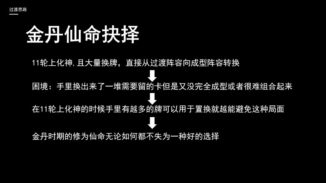 我个人金丹时期推荐选修为仙命的逻辑是这样的,我玩雁子基本是11轮上化神,且在11轮时进行大量换牌,直接从过渡阵容向成型阵容转换,那时基本上是满换牌次数上化神,经常碰到的困境就是手里换出来了一堆需要留的卡但是又没完全成型或者很难组合起来,丢又不舍得丢,D又没牌可D,很容易抱着一堆换牌次数含恨而死,反过来说,在11轮上化神的时候手里有越多的牌可以用于置换就越能避免这种局面,越能快速地完成变身。所以我觉得金丹时期的修为仙命无论如何都不失为一种好的选择。