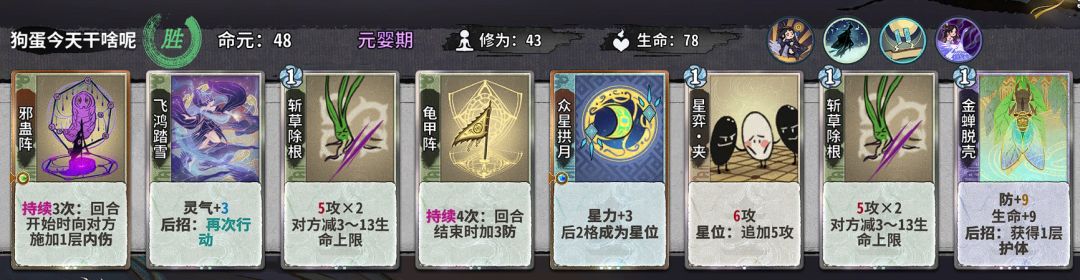 在这里提一个金丹仙命抉择的问题,在其他三个境界都选雁子自身仙命且前期尽量少合牌正常触发勤学苦练的情况下,如果在金丹期不选任何带修为的仙命,十一轮上本的时候会空2张牌,也就是说,如果既想要点雁子的其他全部仙命,又想要在十一轮保持满牌上化神,那在金丹时至少要选2张牌的仙命,如果是选顿悟或者雷劫就还会有多1张余牌可D。