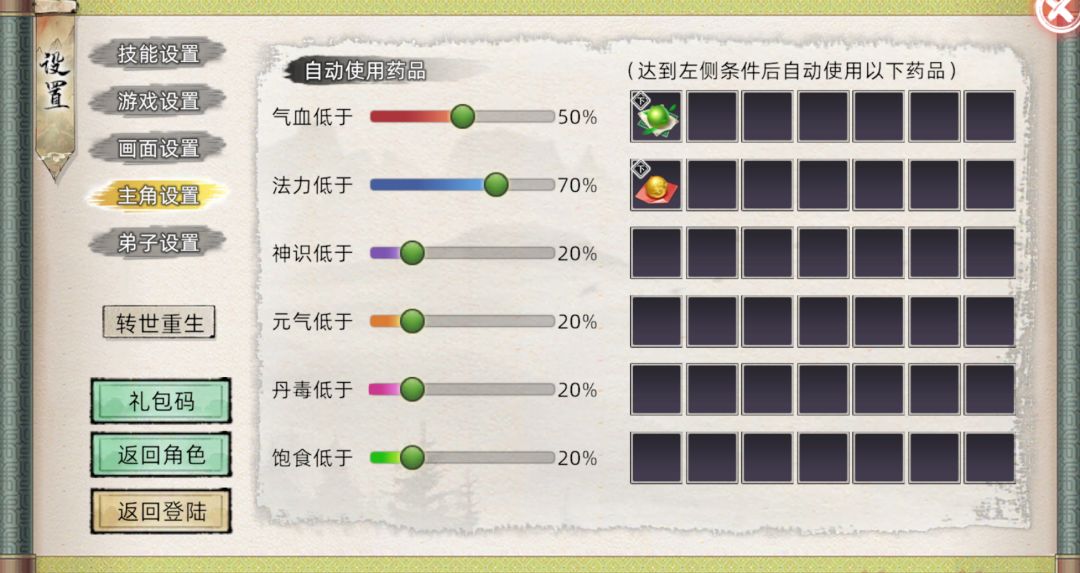 当然游戏也贴心的为我们准备了自动吃药功能,我们设置丹毒低于29%,磕一个药就行了。