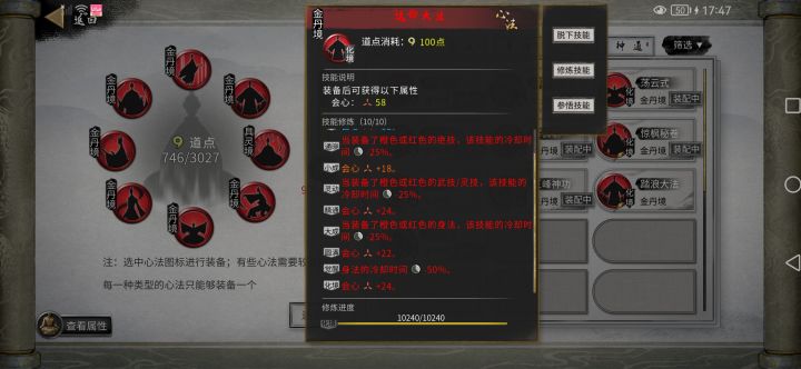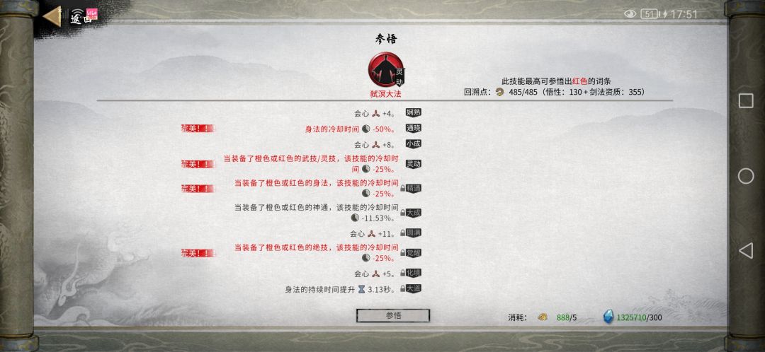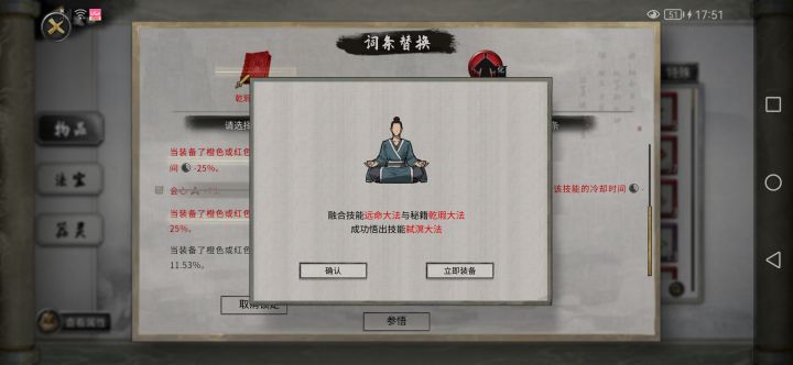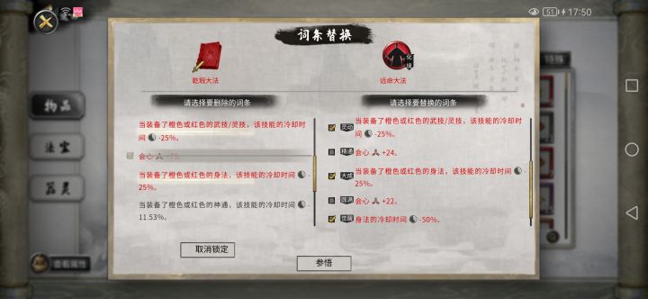 首先把身上低阶的剑大法胚子的必要词条洗成完美词条(图一),然后拿高阶的胚子用界元石道源感悟(图二),最终得到的剑大法依旧是高阶(图四),这样就好洗多了