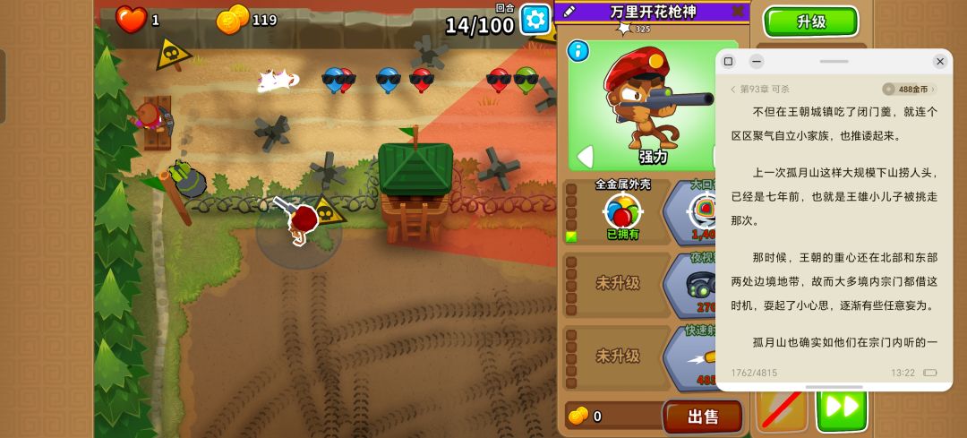 1,用之前憋的钱把刺钉塔点到502,这时候就赢一半了,完全可以解放双手,启动挂机塔防6了。
