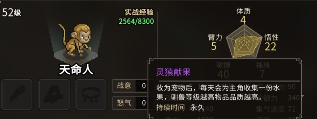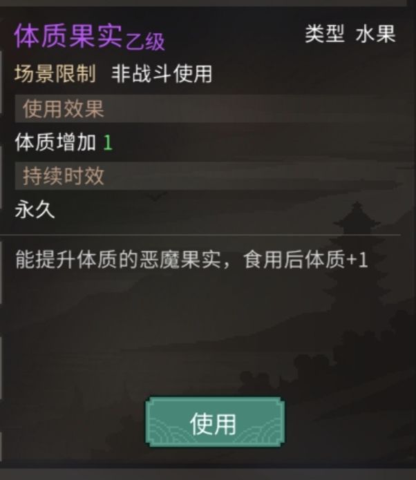 它每天子时随机给你一个体质、臂力、速度、暴击、命中恶魔果实中的一种,没有使用限制,可以无限堆属性;但有时也会给你一个没啥用的椰子。以后带着它闯荡江湖就可以了。