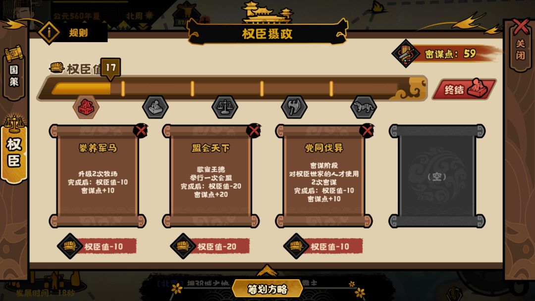 开局权臣值较高时,可以考虑多接取朝会类方略,例如党同伐异、打压朋党等,比较容易完成,等权臣值降低后,可以考虑接取部分建设类、战斗类方略。