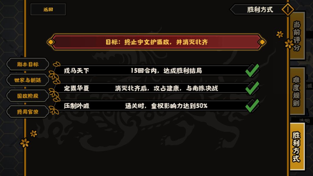 在普通难度以上,完成主要目标与次要目标,即可通过施行对应政策,同时达成高级结局与普通结局——周武开皇与功业待后人