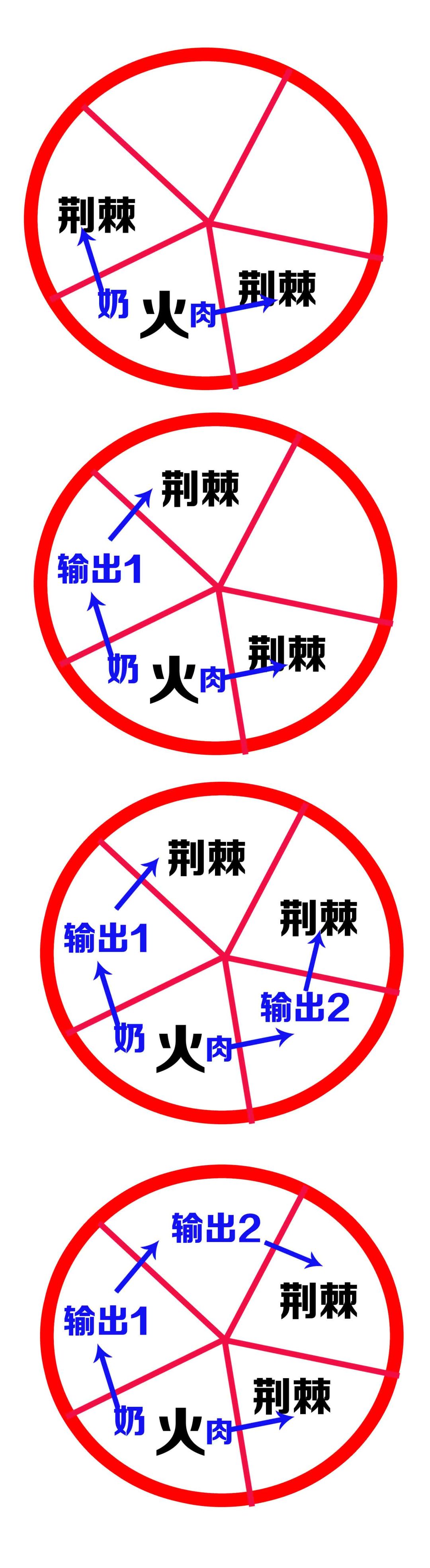 坦奶进火,奶开屏障,头上出现火苗标记(接棒后再走一格,自动传火给同格队友,没队友火直接消失,火可清除荆棘),然后分别一左一右。