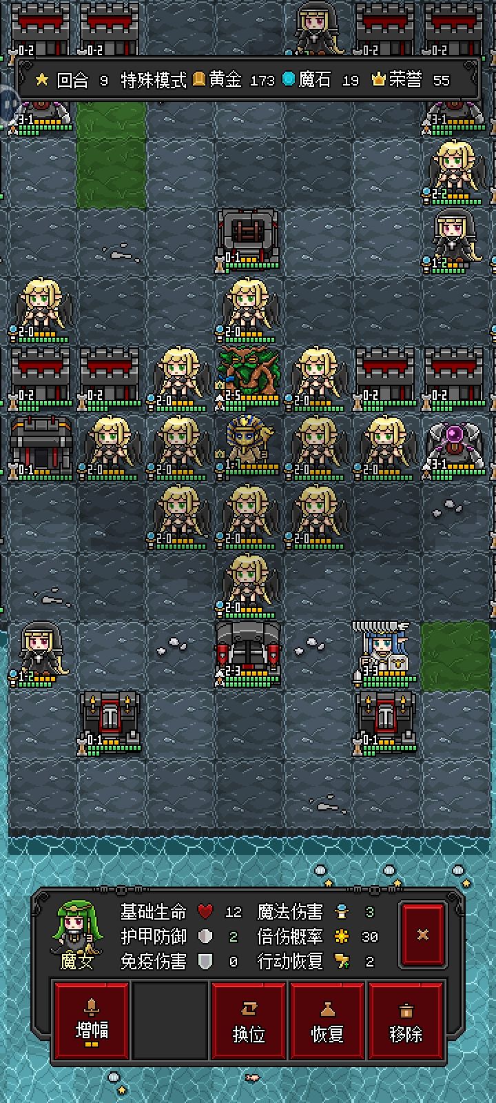 魔女:辅助和控制。加一攻的buff给高行动的单位收益很高,尤其是蝙蝠,魔女a人算是个远程牛头。