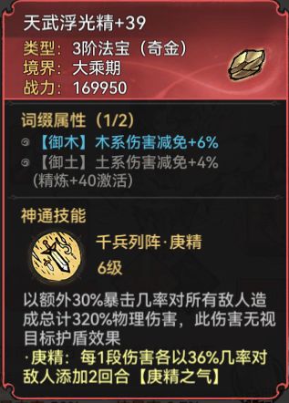 法宝只推荐庚金;700的蓄力值和高贵的群伤技能让其成为卫寒在三阶法宝中的不二之选,适中的蓄力值可以让卫寒更快得开出法宝来吃到红天命的两回合锁血效果,帮助卫寒在复杂的战斗中活下来,且金卫寒一般都是带【天一剑典】作为输出功法,该功法和卫寒自身的技能组都是摸不到后排的,庚金的法宝技能很好的帮金卫寒弥补了这个缺点。