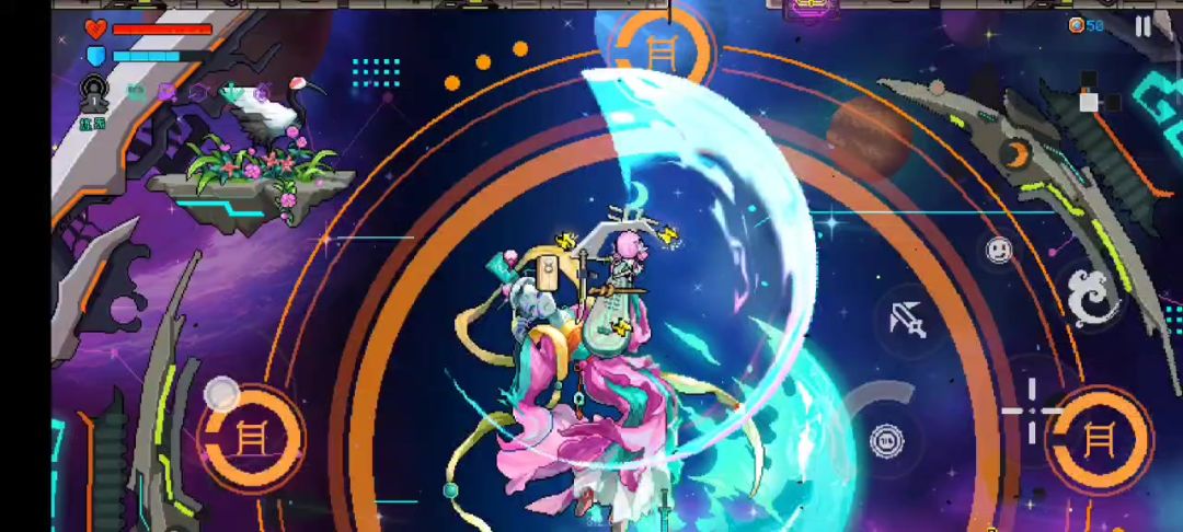 主动技能释放阵法可以暂停敌方发弹幕,在阵法中剑气攻击可以为阵法充能,阵法结束时召唤分身攻击敌人