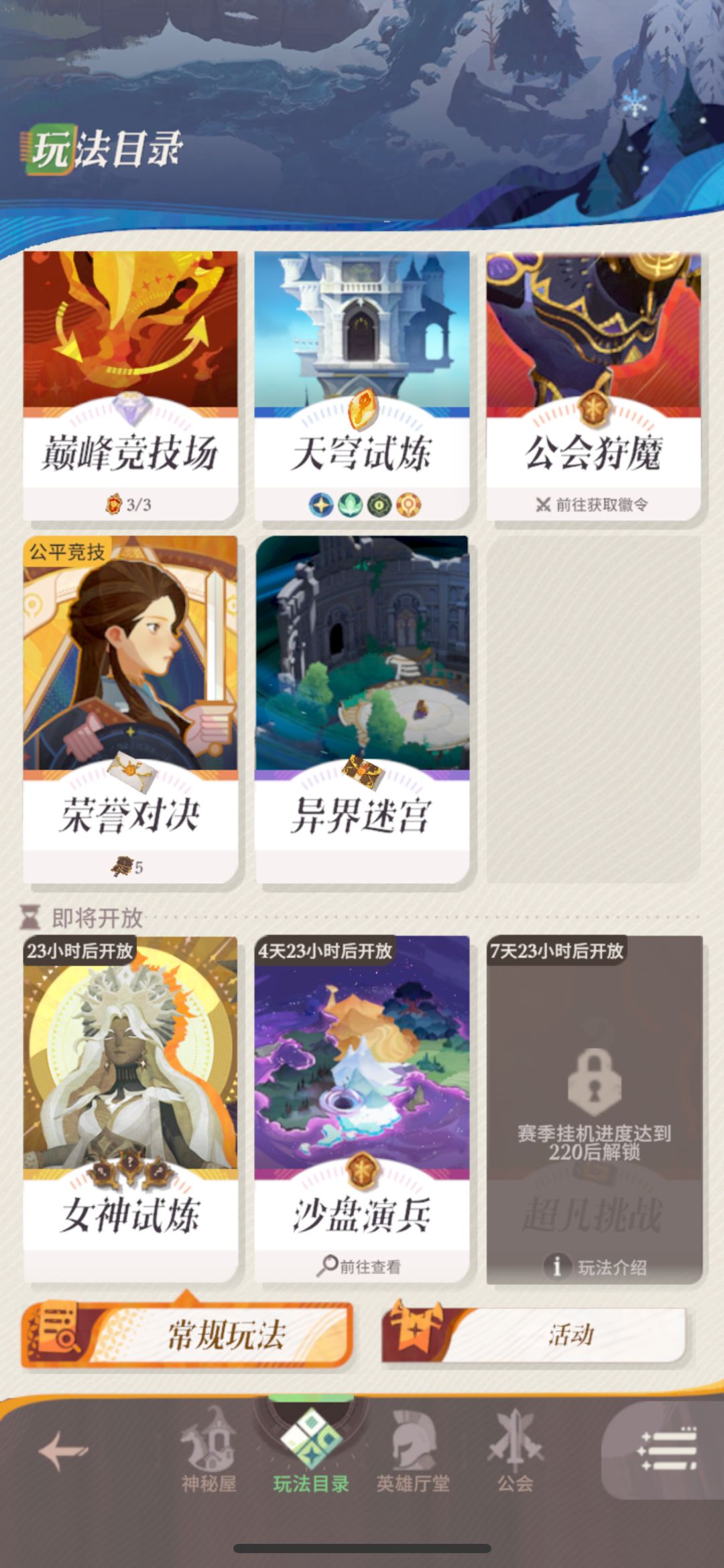 2挂机关卡,快速推关等级领先,解锁玩法活动,解锁巅峰竞技场需要推到130关,女神需要180关,超凡挑战需要220关,尤其是巅峰竞技场,第一天推到130关后就可以往上打名次了,越早越好,这样每日奖励就能多拿不少!快速挂机也是尽量每天都拿满,这样英雄等级提升的快一些,打其他活动的名次也会更高,小舞第一天就推关到200关喽,大家加油!