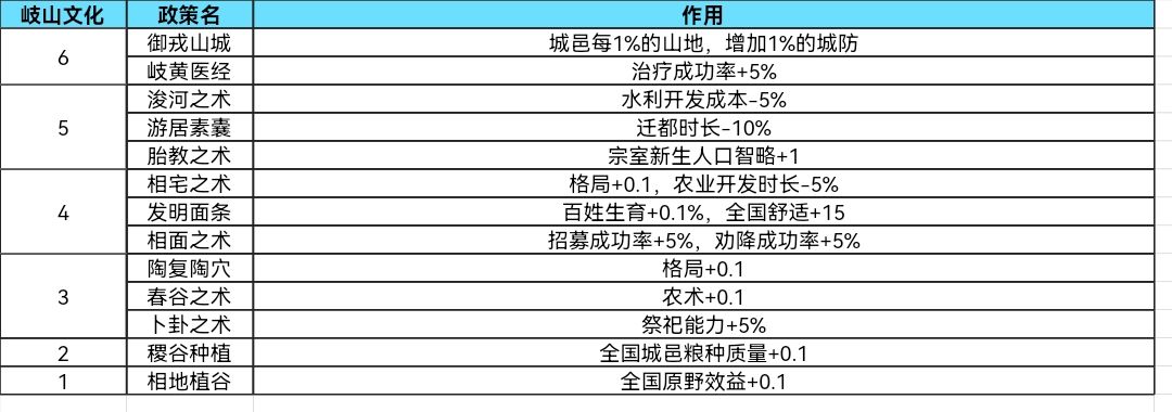 岐山流派的政策无负面政策,整体都是正面,但流派政策相当一般,给的政策都是芝麻大小的加成,整体效果比较杂且强度偏弱。