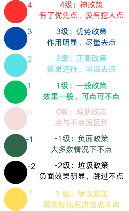 以上为对政策的评级分类标准,共分为﹣2到4共7个主要等级,对于同时具备正负面效果的政策,若在大多数情况下效果相对稳定,则归结为对应等级;反之若在不同条件下差异很大,则归结为争议等级"?级",并对其进行点评分析。关于政策带的加文化效果,本流派对应政策优先级适当提高。其他流派文化只要增长速度总体控制在本流派文化以下,其负面影响基本可以忽略不计。
