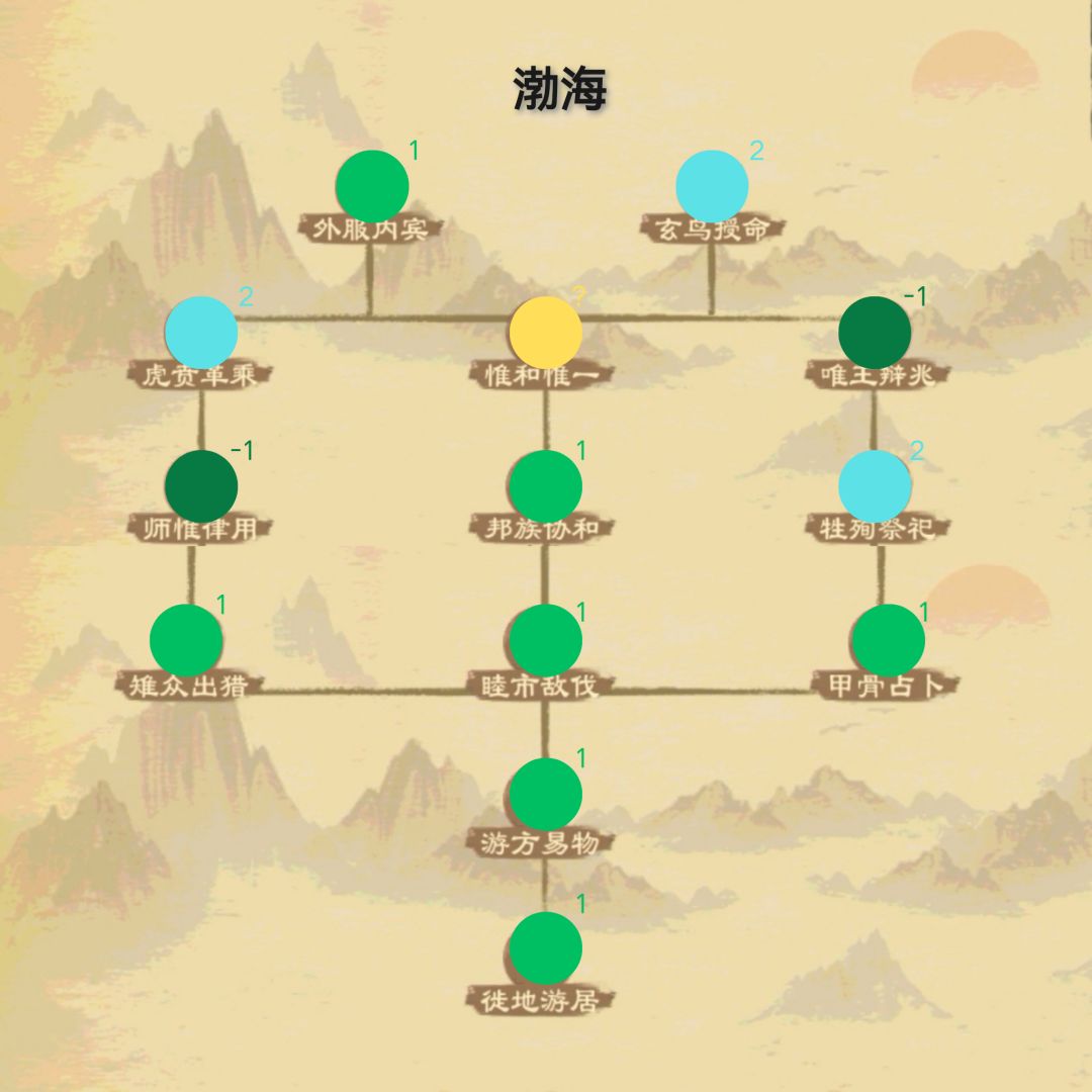 渤海流派的政策偏向于王朝主导国外交以及城邑的三大特性,也包含少量祭祀相关政策,总体来说给的政策效果比较杂乱,流派政策强度中等。