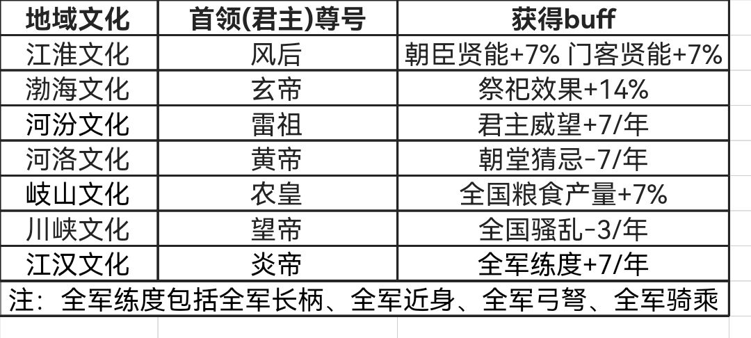 1.当玩家势力通过技术推演的方式(即完成木石时代、族群认同的技术推进),从先民阶段转化到方国阶段时,会根据都城所属地域文化区域获得相应的buff,且首领会获得相应地域尊号。对应关系如下图所示: