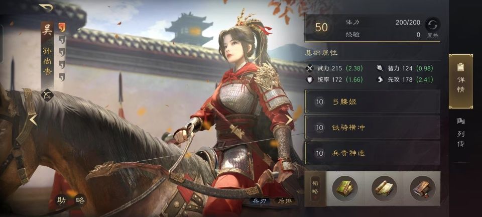 孙尚香战法:弓腰姬+铁骑横冲+兵贵神速。韬略库:专注(专属)+突战善本+疾战善本。