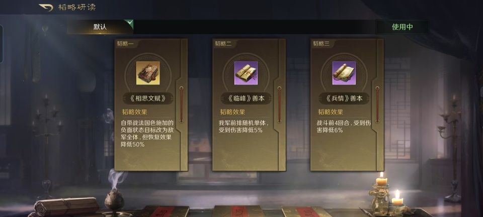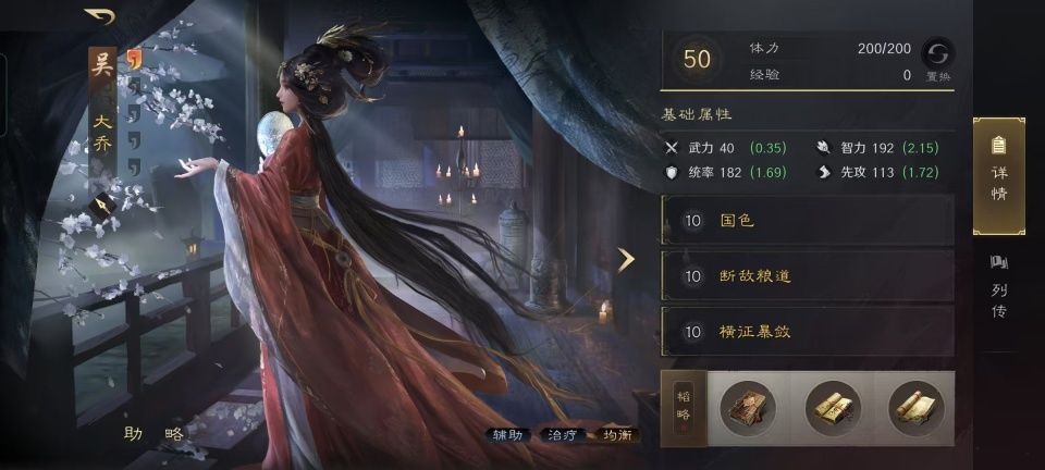 大乔战法:国色+断敌粮道+横征暴敛。韬略库:相思文赋(专属)+临峰善本+兵情善本。