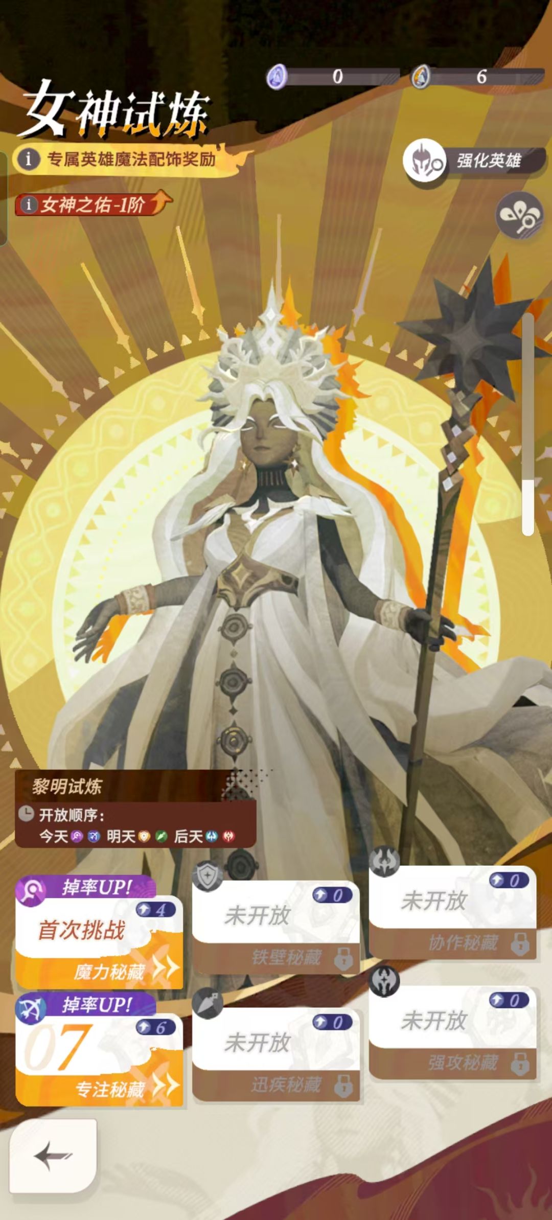 然后就是新赛季的女神试炼也延续了英雄强化这个机制,但是本期女神塔的英雄强化需要站在特定格子上,站在强化格子上的强化英雄会得到属性提升和技能强化,值得注意的是只有站在格子上的强化角色才能得到加成,并不像上赛季上场即享受强化,为女神试炼提供了更多的选择。