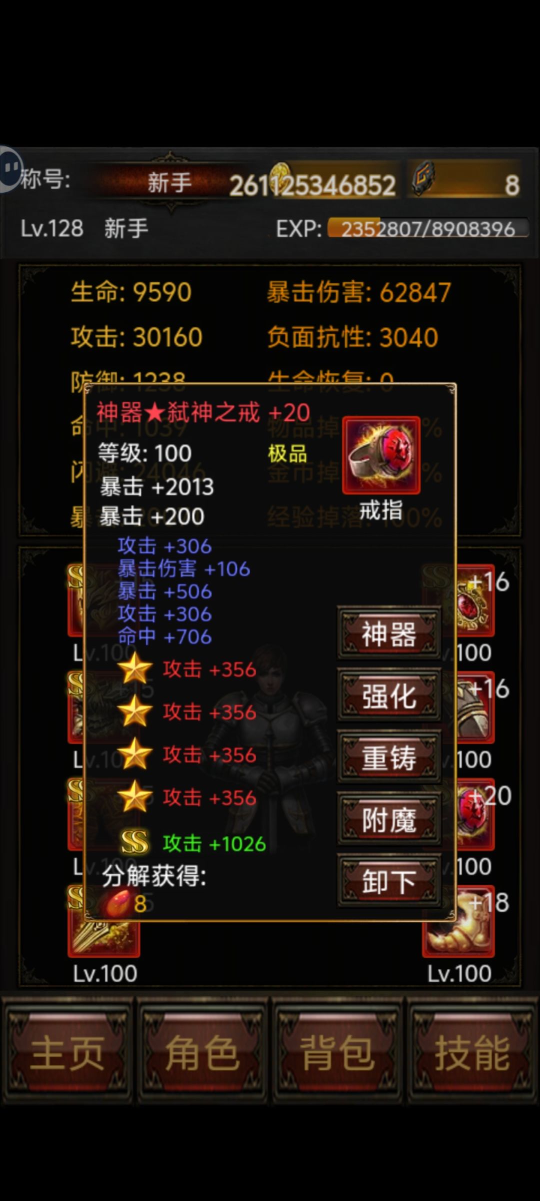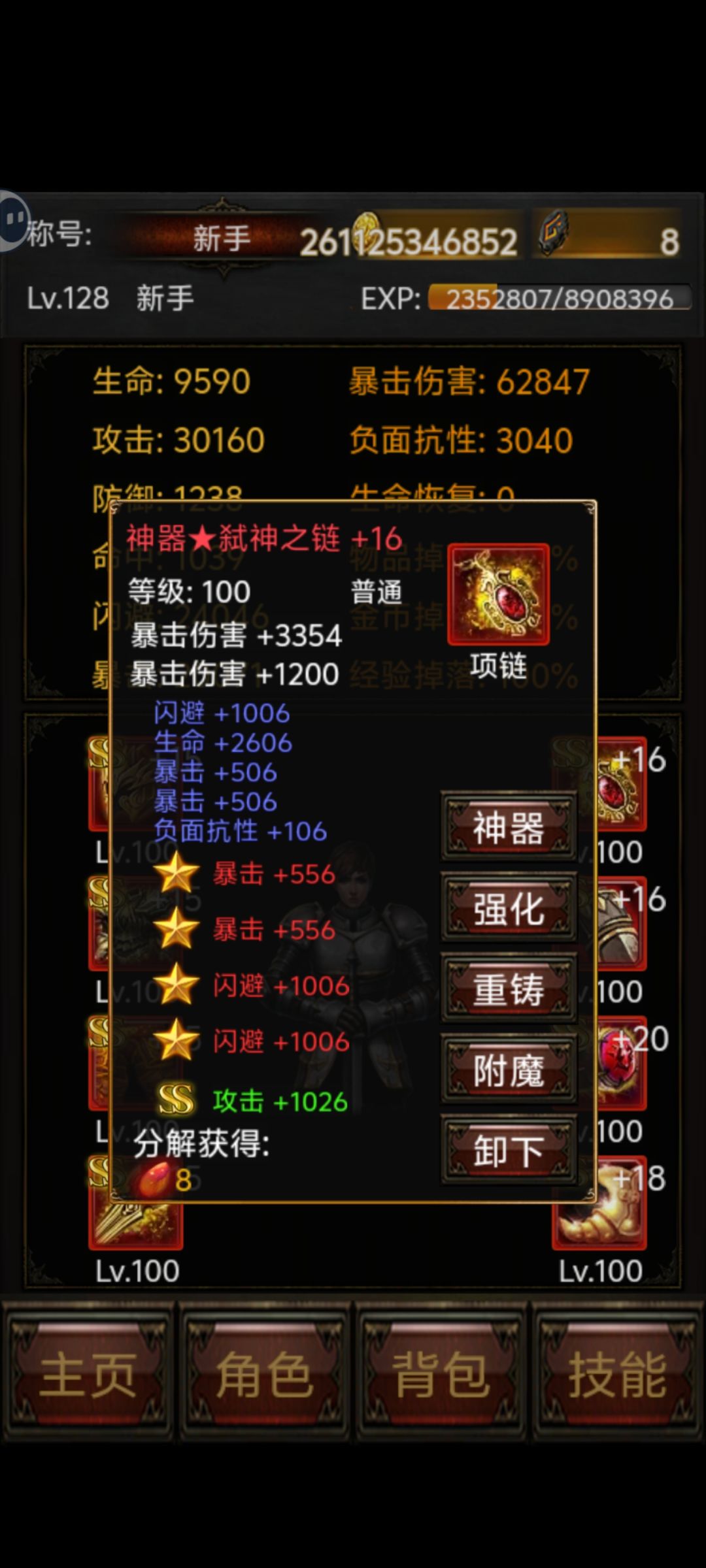 主要属性就是攻击(越高越好)、暴击(堆到 2 万就行 不是暴击伤害)、闪避(试来试去 2.4 万挂机最安全)就这三个其他属性全是垃圾。