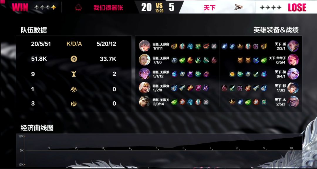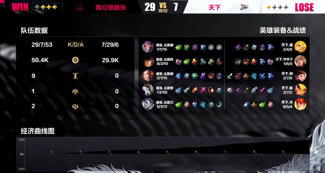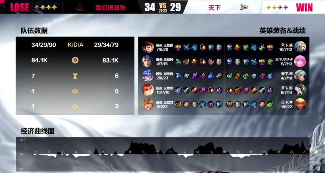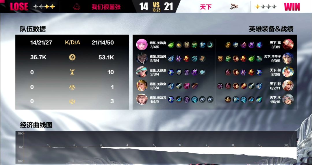 第三局:在这局当中嚣张的bp出了一点小小的失误,由于选择了姜子牙和玄奘同时出的阵容,导致没有能够有效保住黄月英的手段,让华华子的李靖在赛场上如入无人之境。前期双方还能打个平手,但从第一条寒冰支配者被天下夺下之后,风向就开始向天下战队这边倾倒了。到了6分钟的时候,天下已经积累了9k的经济优势,甚至没有让嚣张拿到任何野区高级资源。10分23秒,天下带着16k的经济优势强上高地,即便是强如嚣张战队,在面对强敌的时候,也是稍有疏忽就不得不痛失一局。