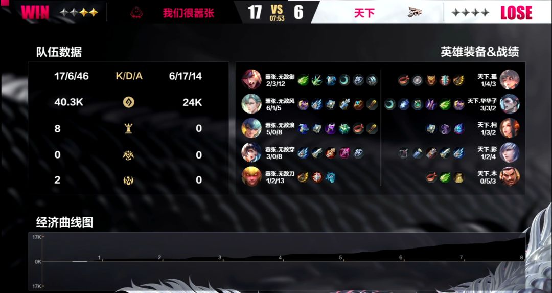 第六局:这一局在前期依旧是很有悬念的,天下的张出尘在开局就拿到了嚣张的两个击杀,让嚣张不得不谨慎应对。不过嚣张的运营节奏确确实实是顶级的,即便是在天崩开局和第一条寒冰支配者都被天下拿下的情况下他们还能掌握3k的经济优势。转折点出现在5分半钟的那一波寒冰支配者团战,嚣张不仅拿到了龙还给天下打出了一波2换4,至此胜利的天平还是渐渐倾向于嚣张一边。虽然天下紧追不舍,似的到了10分钟的时候嚣张还是仅有5k的经济优势,双方并没有拉开差距。然而紧接着的熔岩毁灭者团战当中,嚣张的一波1换5粉碎了天下翻盘的梦想,最终双方高地决战打出一波惨烈的4换4,却最终无法阻止嚣张强行点掉水晶,只得眼睁睁的看着嚣张战队将冰雪杯总冠军的奖杯夺走。